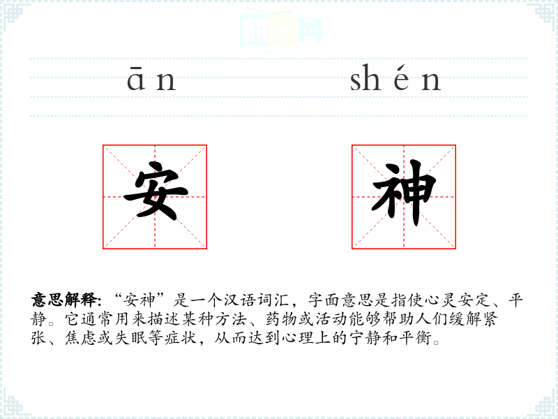“安神”是一个汉语词汇,字面意思是指使心灵安定、平静。它通常用来描述某种方法、药物或活动能够帮助人们缓解紧张、焦虑或失眠等症状,从而达到心理上的宁静和平衡。
