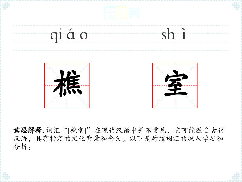 词汇“[樵室]”在现代汉语中并不常见,它可能源自古代汉语,具有特定的文化背景和含义。以下是对该词汇的深入学*和分析: