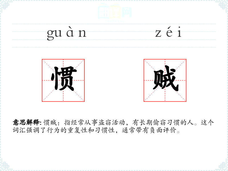 - 反义词:守法公民、模范市民。这些词汇与“惯贼”形成鲜明对比,强调了遵守法律和道德的行为。