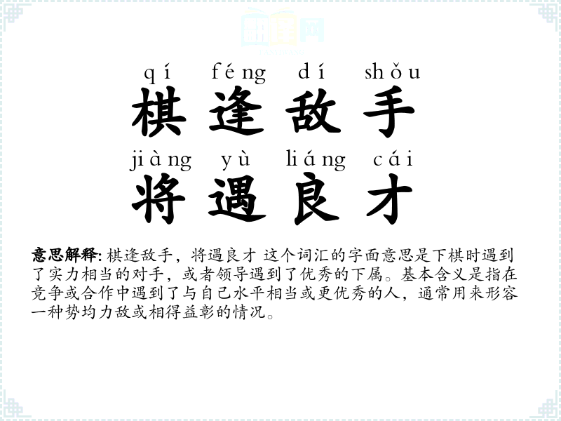 棋逢敌手,将遇良才 这个词汇的字面意思是下棋时遇到了实力相当的对手,或者领导遇到了优秀的下属。基本含义是指在竞争或合作中遇到了与自己水平相当或更优秀的人,通常用来形容一种势均力敌或相得益彰的情况。