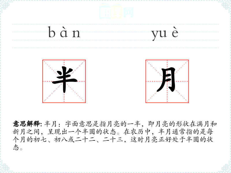 半月:字面意思是指月亮的一半,即月亮的形状在满月和新月之间,呈现出一个半圆的状态。在农历中,半月通常指的是每个月的初七、初八或二十二、二十三,这时月亮正好处于半圆的状态。