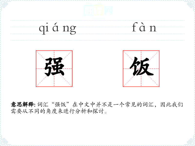由于“强饭”不是一个标准的中文词汇,它在中文中的使用和理解可能非常有限。如果它是一个方言词汇或网络用语,可能需要具体的语境和研究来深入理解。在语言学习和表达中,了解和掌握标准的中文词汇是非常重要的。