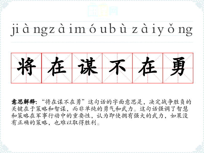 “将在谋不在勇”这句话强调了策略和智慧在解决问题中的重要性。在语言学*和表达中,这句话提醒我们在面对挑战时,应采取理性、策略性的方法,而非仅仅依赖勇气和冲动。