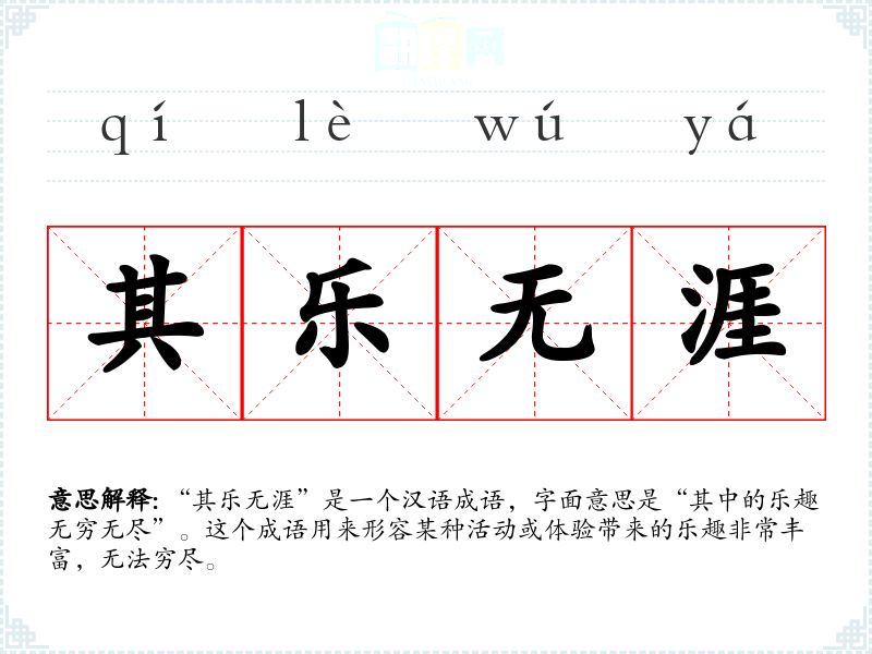 “其乐无涯”是一个汉语成语,字面意思是“其中的乐趣无穷无尽”。这个成语用来形容某种活动或体验带来的乐趣非常丰富,无法穷尽。