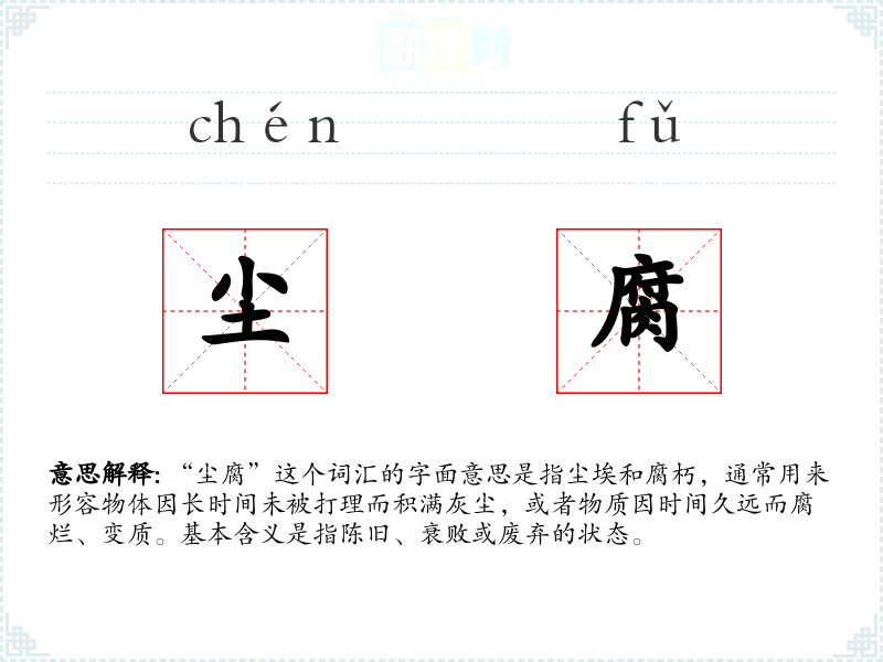 “尘腐”这个词汇的字面意思是指尘埃和腐朽,通常用来形容物体因长时间未被打理而积满灰尘,或者物质因时间久远而腐烂、变质。基本含义是指陈旧、衰败或废弃的状态。