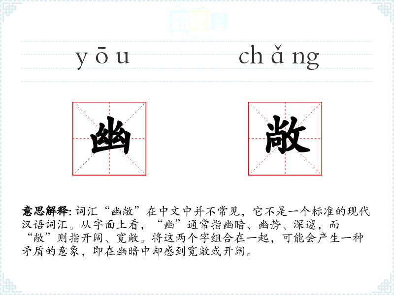 词汇“幽敞”在中文中并不常见,它不是一个标准的现代汉语词汇。从字面上看,“幽”通常指幽暗、幽静、深邃,而“敞”则指开阔、宽敞。将这两个字组合在一起,可能会产生一种矛盾的意象,即在幽暗中却感到宽敞或开阔。