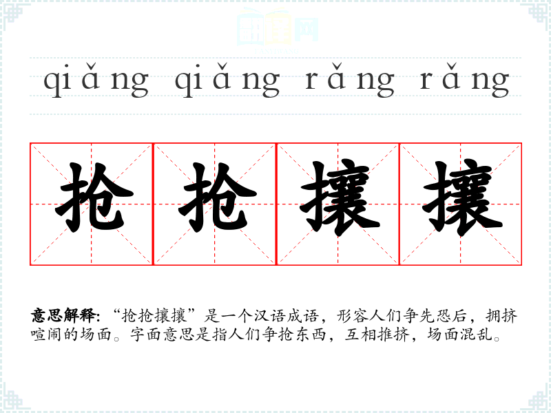 “抢抢攘攘”是一个汉语成语,形容人们争先恐后,拥挤喧闹的场面。字面意思是指人们争抢东西,互相推挤,场面混乱。