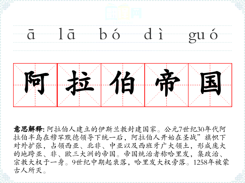 1.阿拉伯人建立的伊斯兰教封建国家。公元7世纪30年代阿拉伯半岛在穆罕默德领导下统一后,阿拉伯人开始在圣战”旗帜下对外扩张,占领西亚、北非、中亚以及西班牙广大领土,形成庞大的地跨亚、非、欧三大洲的帝国。帝国统治者称哈里发,集政治、宗教大权于一身。9世纪中期起衰落,哈里发大权旁落。1258年被蒙古人所灭。