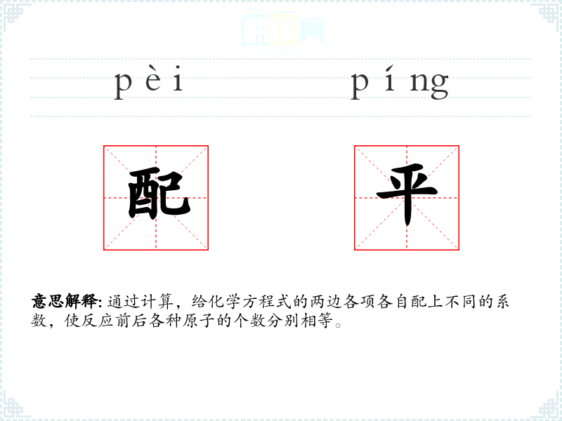 通过计算,给化学方程式的两边各项各自配上不同的系数,使反应前后各种原子的个数分别相等。