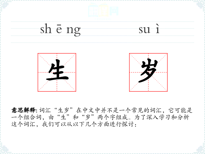 - 反义词:无(因为“生岁”不是一个常用词汇,反义词不明显)
