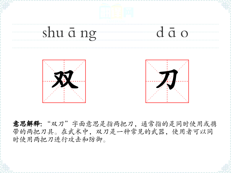 “双刀”字面意思是指两把刀,通常指的是同时使用或携带的两把刀具。在武术中,双刀是一种常见的武器,使用者可以同时使用两把刀进行攻击和防御。