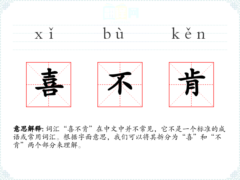 词汇“喜不肯”在中文中并不常见,它不是一个标准的成语或常用词汇。根据字面意思,我们可以将其拆分为“喜”和“不肯”两个部分来理解。