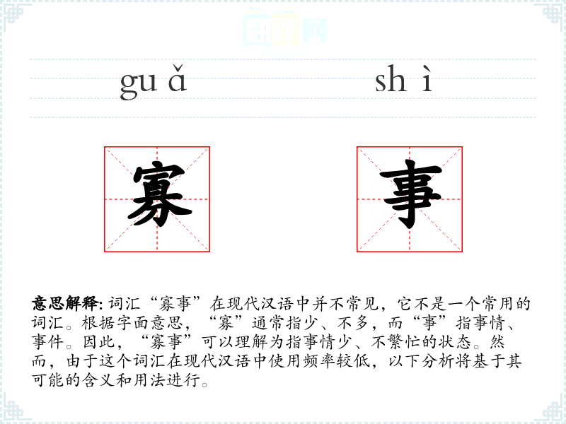 词汇“寡事”在现代汉语中并不常见,它不是一个常用的词汇。根据字面意思,“寡”通常指少、不多,而“事”指事情、**。因此,“寡事”可以理解为指事情少、不繁忙的状态。然而,由于这个词汇在现代汉语中使用频率较低,以下分析将基于其可能的含义和用法进行。