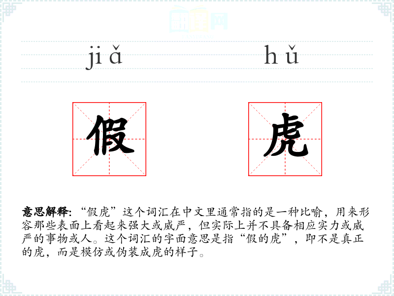 “假虎”这个词汇在中文里通常指的是一种比喻,用来形容那些表面上看起来强大或威严,但实际上并不具备相应实力或威严的事物或人。这个词汇的字面意思是指“假的虎”,即不是真正的虎,而是模仿或伪装成虎的样子。