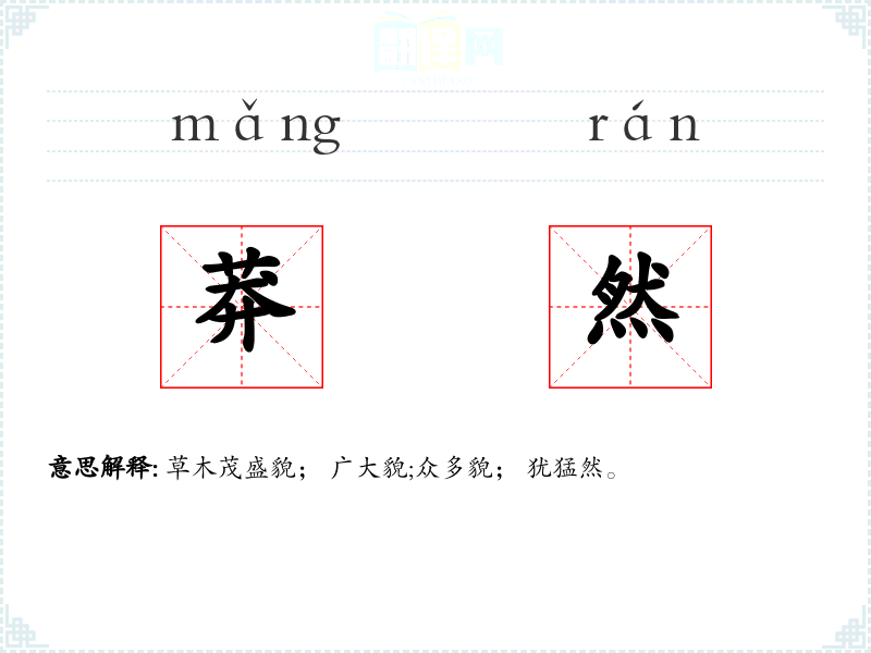 草木茂盛貌; 广大貌;众多貌; 犹猛然。