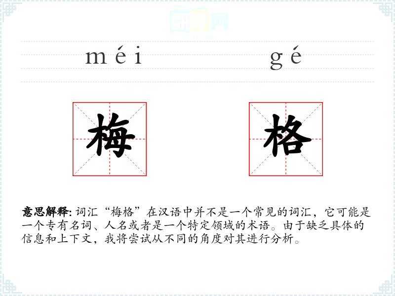由于“梅格”不是一个标准汉语词汇,对其的理解和应用需要具体的上下文。在语言学习和表达中,了解词汇的具体含义和用法是非常重要的。