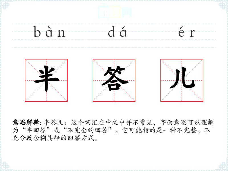 半答儿:这个词汇在中文中并不常见,字面意思可以理解为“半回答”或“不完全的回答”。它可能指的是一种不完整、不充分或含糊其辞的回答方式。