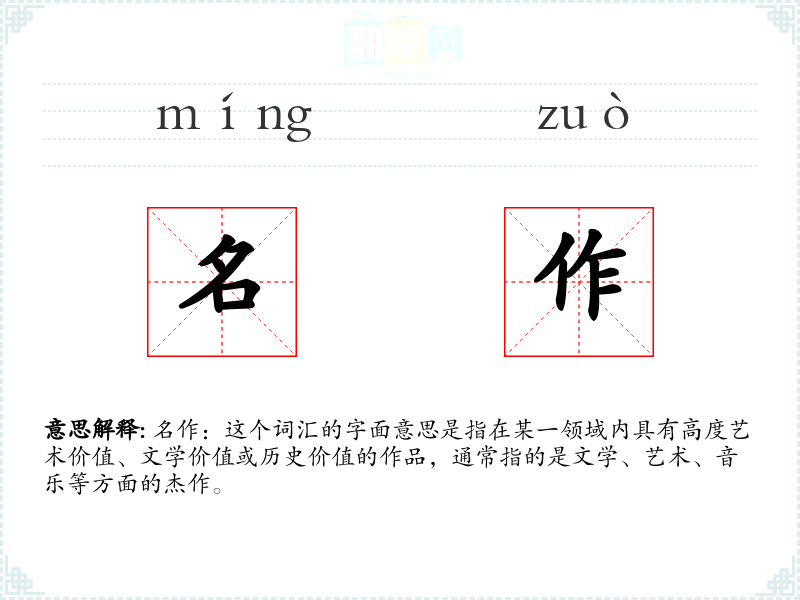 名作:这个词汇的字面意思是指在某一领域内具有高度艺术价值、文学价值或历史价值的作品,通常指的是文学、艺术、音乐等方面的杰作。