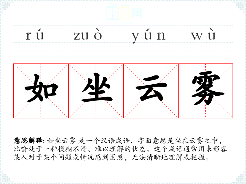 如坐云雾 是一个汉语成语,字面意思是坐在云雾之中,比喻处于一种模糊不清、难以理解的状态。这个成语通常用来形容某人对于某个问题或情况感到困惑,无法清晰地理解或把握。