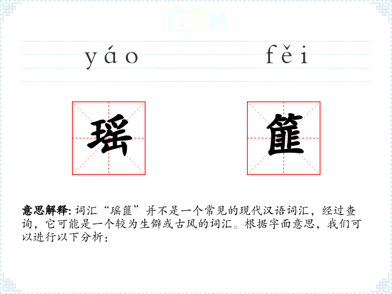 词汇“瑶篚”并不是一个常见的现代汉语词汇,经过查询,它可能是一个较为生僻或古风的词汇。根据字面意思,我们可以进行以下分析: