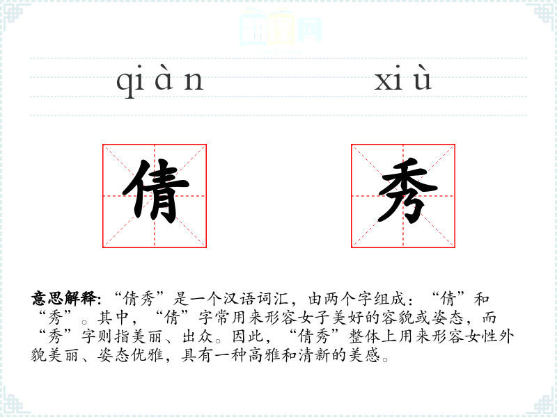 “倩秀”是一个汉语词汇,由两个字组成:“倩”和“秀”。其中,“倩”字常用来形容女子美好的容貌或姿态,而“秀”字则指美丽、出众。因此,“倩秀”整体上用来形容女性外貌美丽、姿态优雅,具有一种高雅和清新的美感。