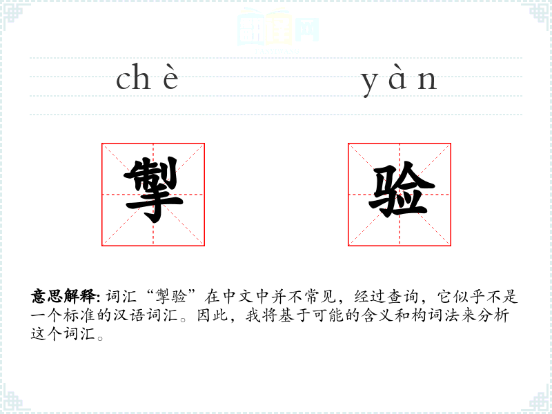 词汇“掣验”在中文中并不常见,经过查询,它似乎不是一个标准的汉语词汇。因此,我将基于可能的含义和构词法来分析这个词汇。