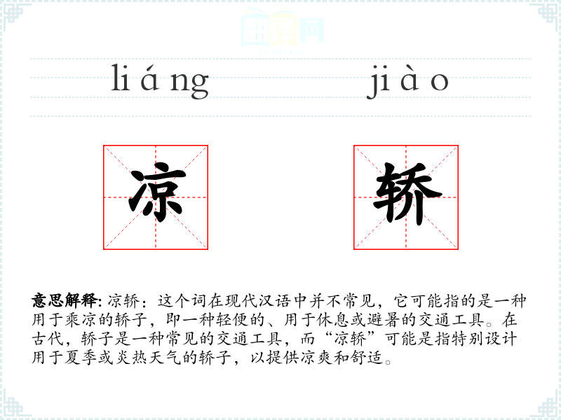 词源:凉轿这个词可能源自古代汉语,其中“凉”指的是凉爽,“轿”指的是一种交通工具。