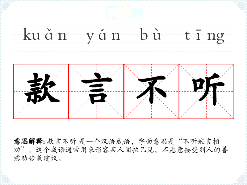款言不听 是一个汉语成语,字面意思是“不听婉言相劝”。这个成语通常用来形容某人固执己见,不愿意接受别人的善意劝告或建议。