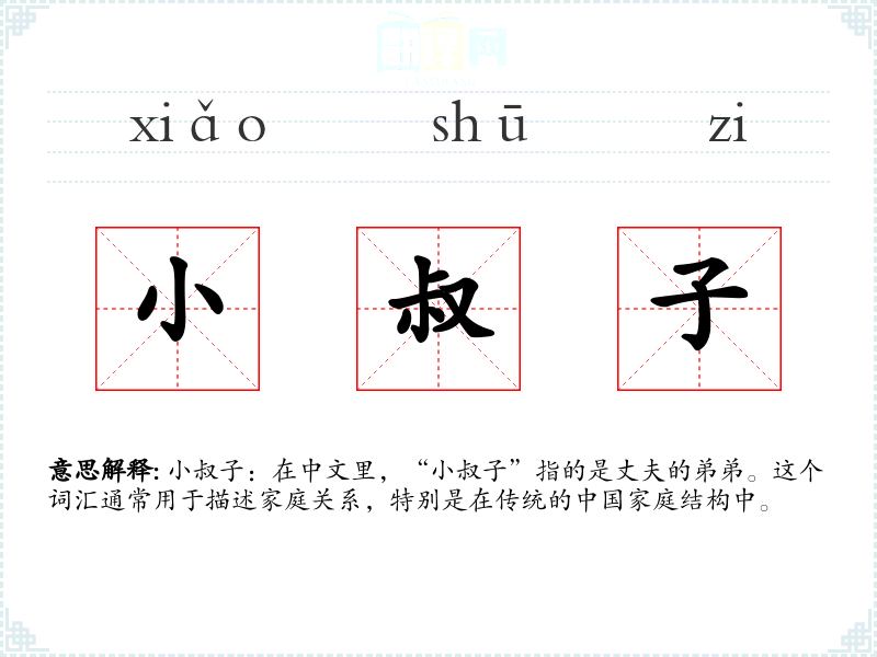 小叔子:在中文里,“小叔子”指的是丈夫的弟弟。这个词汇通常用于描述家庭关系,特别是在传统的**家庭结构中。
