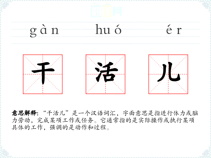 “干活儿”是一个汉语词汇,字面意思是指进行体力或脑力劳动,完成某项工作或任务。它通常指的是实际操作或执行某项具体的工作,强调的是动作和过程。