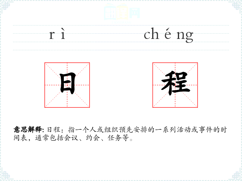 - 专业领域:在商业或行政管理中,日程通常指会议、项目或其他工作任务的时间安排。