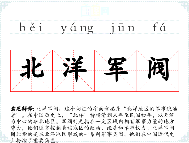 北洋军阀:这个词汇的字面意思是“北洋地区的军事统治者”。在历史上,“北洋”特指清朝末年至民国初年,以天津为中心的华北地区。军阀则是指在一定区域内拥有军事力量的地方势力,他们通常控制着该地区的政治、经济和军事权力。北洋军阀因此指的是在北洋地区形成的一系列军事集团,他们在近代史上扮演了重要角色。