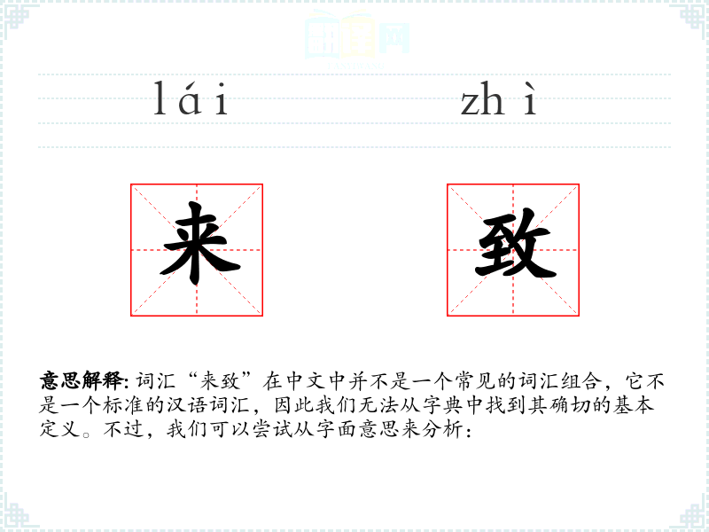 - 由于“来致”不是一个标准词汇,它在不同语境下的使用非常有限,可能出现在某些特定的文学作品或口语表达中,但这种情况极为罕见。