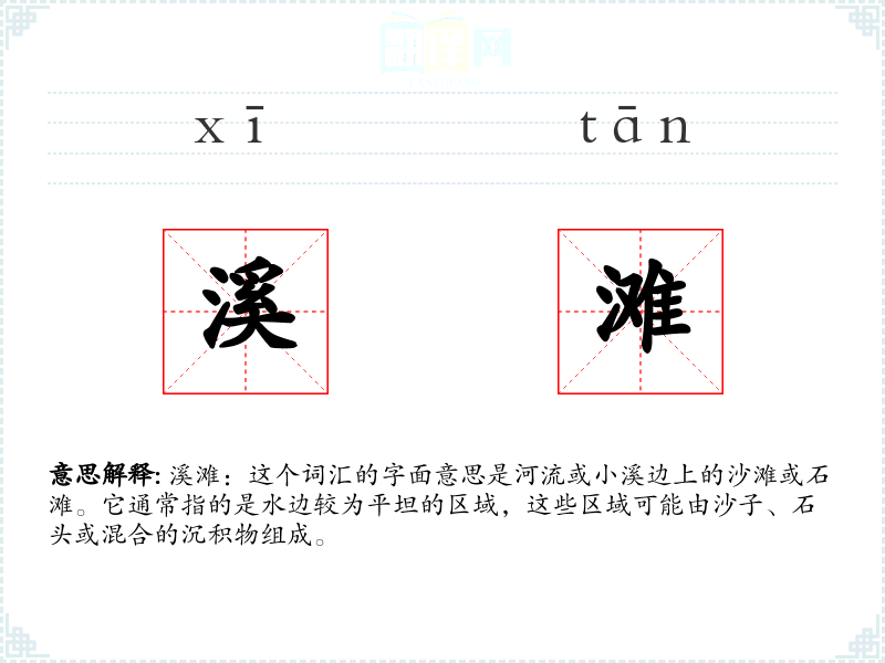 溪滩:这个词汇的字面意思是河流或小溪边上的沙滩或石滩。它通常指的是水边较为平坦的区域,这些区域可能由沙子、石头或混合的沉积物组成。