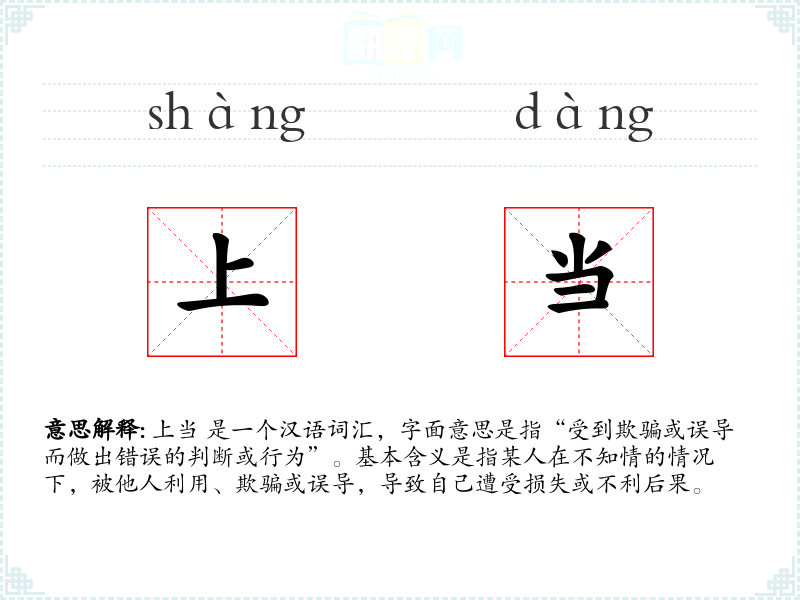 上当 是一个汉语词汇,字面意思是指“受到欺骗或误导而做出错误的判断或行为”。基本含义是指某人在不知情的情况下,被他人利用、欺骗或误导,导致自己遭受损失或不利后果。