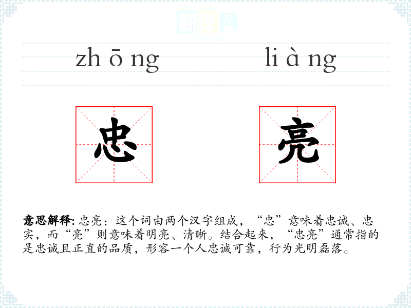 忠亮:这个词由两个汉字组成,“忠”意味着忠诚、忠实,而“亮”则意味着明亮、清晰。结合起来,“忠亮”通常指的是忠诚且正直的品质,形容一个人忠诚可靠,行为光明磊落。
