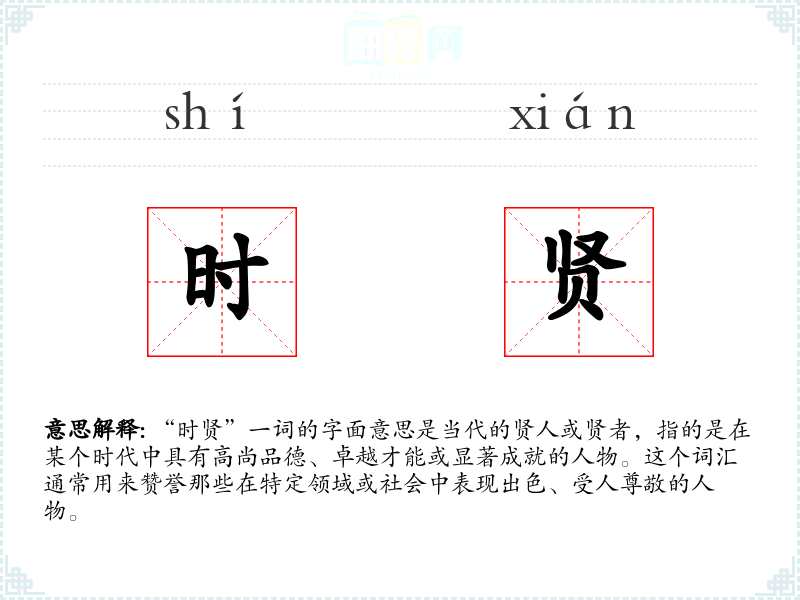 “时贤”一词的字面意思是当代的贤人或贤者,指的是在某个时代中具有高尚品德、卓越才能或显著成就的人物。这个词汇通常用来赞誉那些在特定领域或社会中表现出色、受人尊敬的人物。