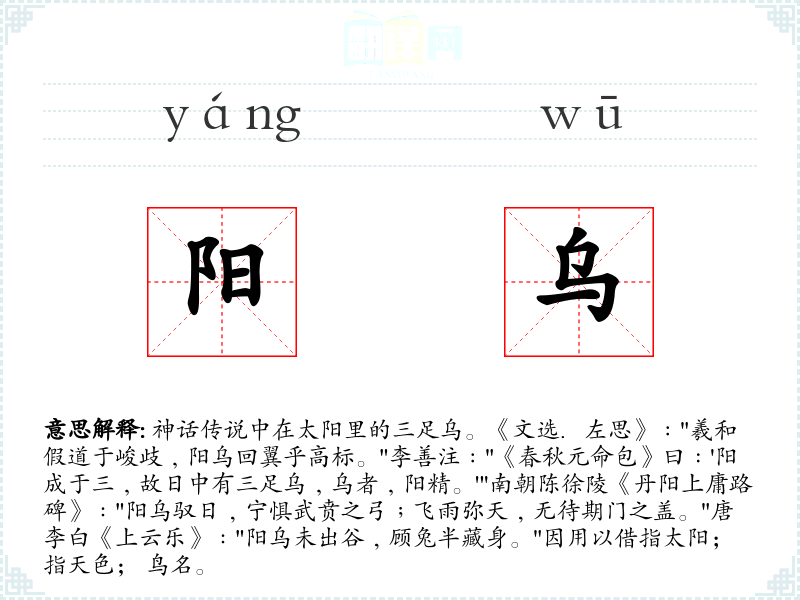 1.神话传说中在太阳里的三足乌。《文选.左思》﹕"羲和假道于峻歧﹐阳乌回翼乎高标。"李善注﹕"《春秋元命包》曰﹕'阳成于三﹐故日中有三足乌﹐乌者﹐阳精。'"南朝陈徐陵《丹阳上庸路碑》﹕"阳乌驭日﹐宁惧武贲之弓﹔飞雨弥天﹐无待期门之盖。"唐李白《上云乐》﹕"阳乌未出谷﹐顾兔半藏身。"因用以借指太阳; 指天色; 鸟名。