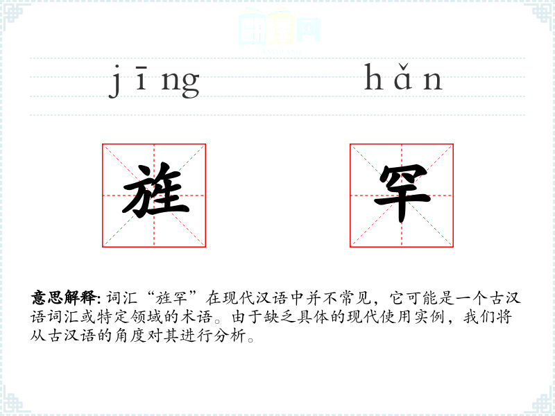 词汇“旌罕”在现代汉语中并不常见,它可能是一个古汉语词汇或特定领域的术语。由于缺乏具体的现代使用实例,我们将从古汉语的角度对其进行分析。