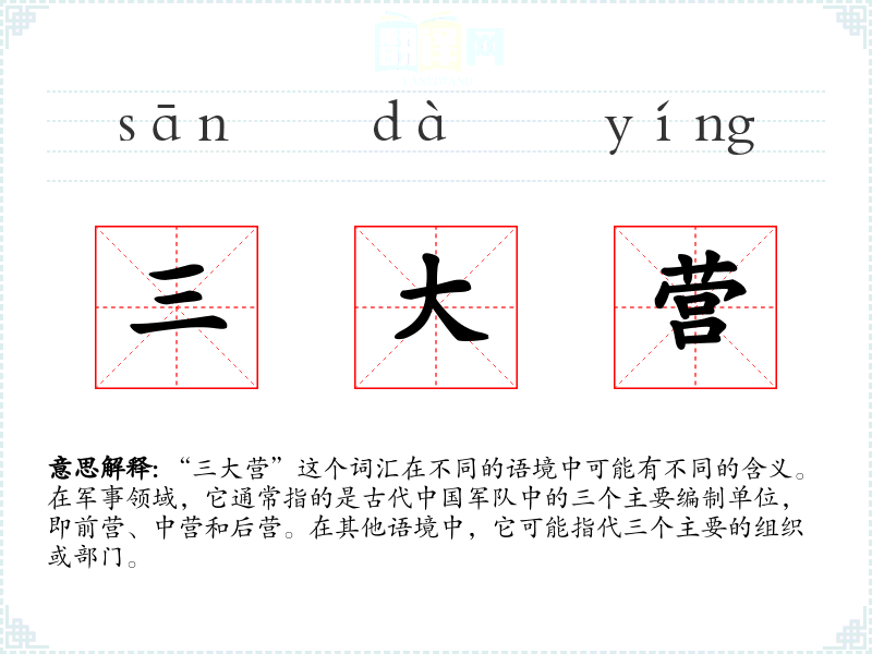 “三大营”这个词汇在军事、商业和文学等多个领域都有应用,其丰富的历史背景和文化内涵使其成为一个有趣且多功能的词汇。在语言学*和表达中,理解和灵活运用这样的词汇可以增强语言的深度和广度。