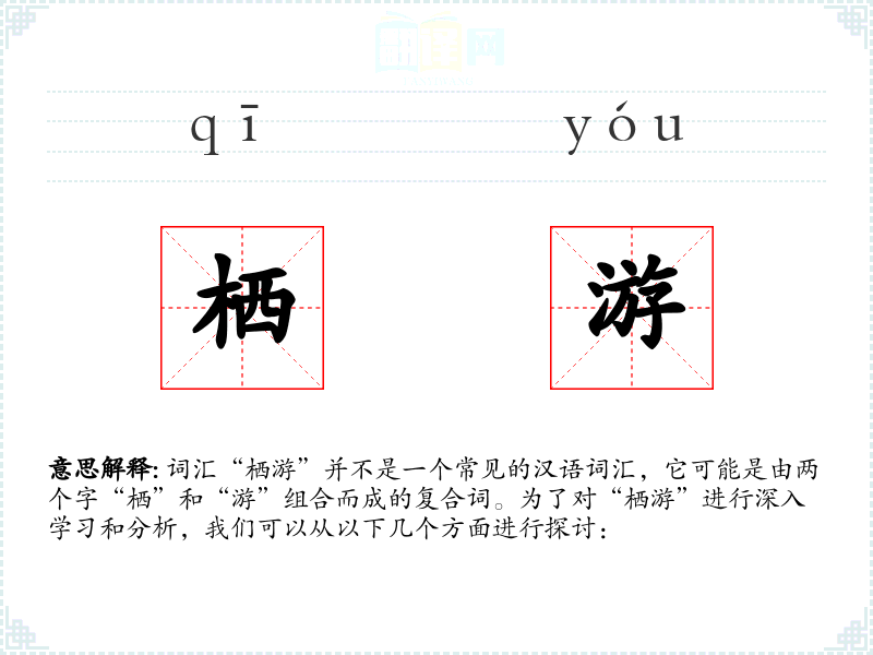 词汇“栖游”并不是一个常见的汉语词汇,它可能是由两个字“栖”和“游”组合而成的复合词。为了对“栖游”进行深入学*和分析,我们可以从以下几个方面进行探讨:
