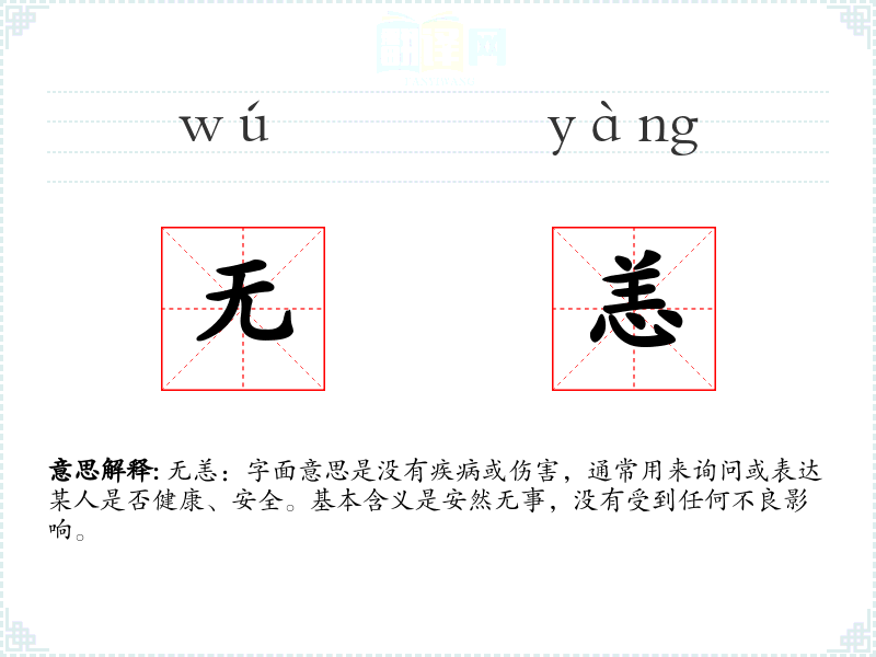 无恙:字面意思是没有疾病或伤害,通常用来询问或表达某人是否健康、安全。基本含义是安然无事,没有受到任何不良影响。