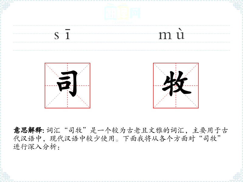 词汇“司牧”是一个较为古老且文雅的词汇,主要用于古代汉语中,现代汉语中较少使用。下面我将从各个方面对“司牧”进行深入分析: