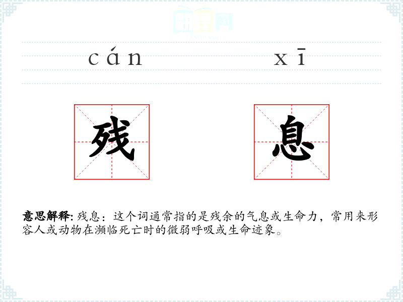 “残息”这个词由“残”和“息”两个字组成。“残”意味着剩余或不完整,“息”则指呼吸或生命力。这个词在古代汉语中就已经存在,用来描述生命的微弱状态。