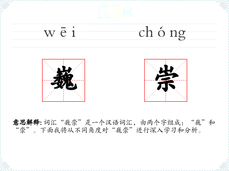 - 词源:“巍”和“崇”都是古代汉语词汇,历史悠久。