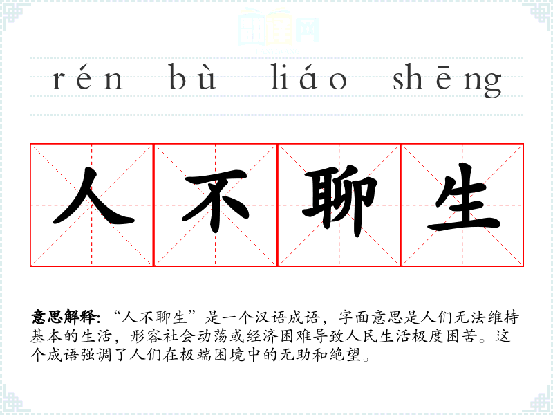 “人不聊生”是一个汉语成语,字面意思是人们无法维持基本的生活,形容社会动荡或经济困难导致人民生活极度困苦。这个成语强调了人们在极端困境中的无助和绝望。