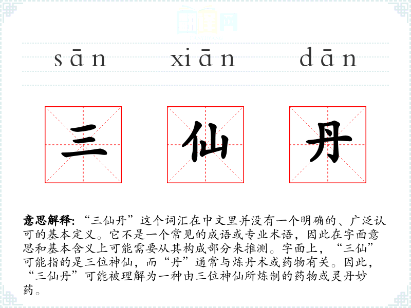 由于“三仙丹”是一个特定文化背景下的词汇,它在其他语言或文化中可能没有直接对应的词汇。在西方文化中,类似的神秘药物可能被称为“Elixir of Life”(长生不老药)。