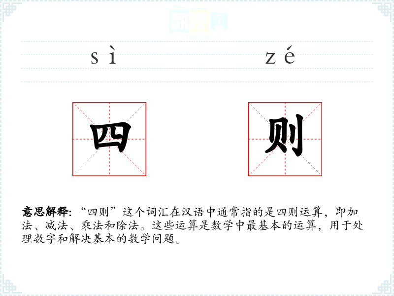“四则”这个词汇在汉语中通常指的是四则运算,即加法、减法、乘法和除法。这些运算是数学中最基本的运算,用于处理数字和解决基本的数学问题。