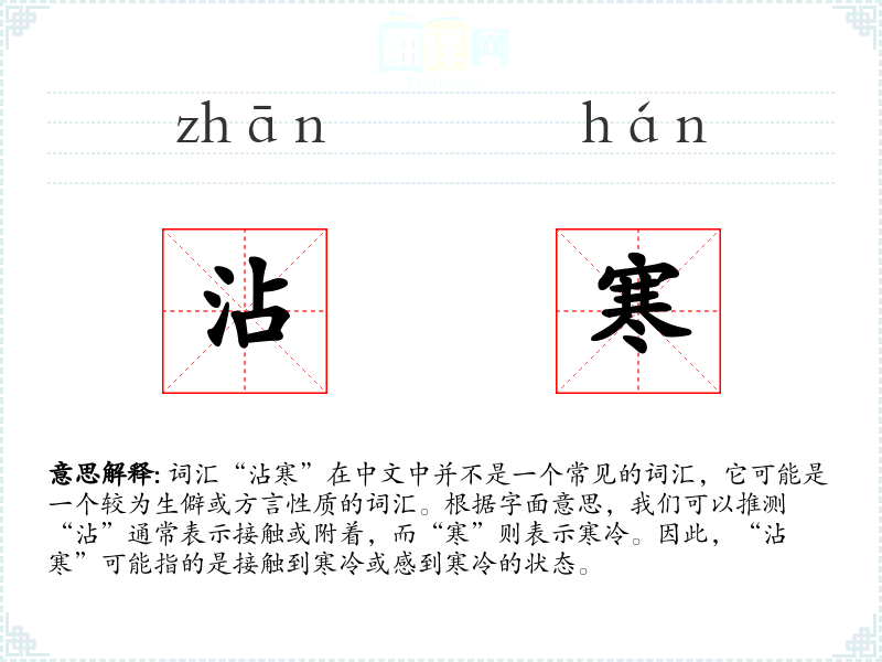 词汇“沾寒”在中文中并不是一个常见的词汇,它可能是一个较为生僻或方言性质的词汇。根据字面意思,我们可以推测“沾”通常表示接触或附着,而“寒”则表示寒冷。因此,“沾寒”可能指的是接触到寒冷或感到寒冷的状态。