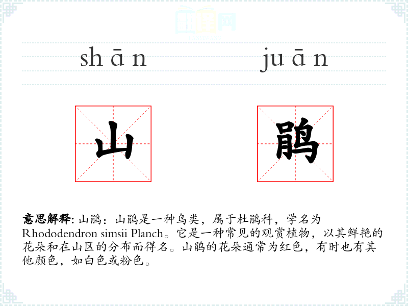 山鹃一词源自汉语,直接指代这种植物。在古代文献中,山鹃常被提及,尤其是在描述自然景观和植物的诗歌中。随着时间的推移,山鹃的名称和形象在文学和日常生活中得到了广泛传播。